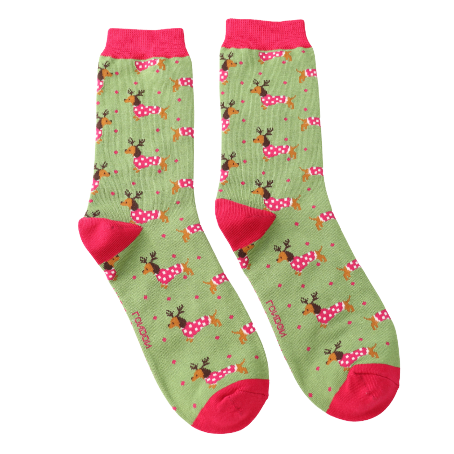 A pair of socks featuring trash pandas. Green legs, dark green heel, toe and cuff.