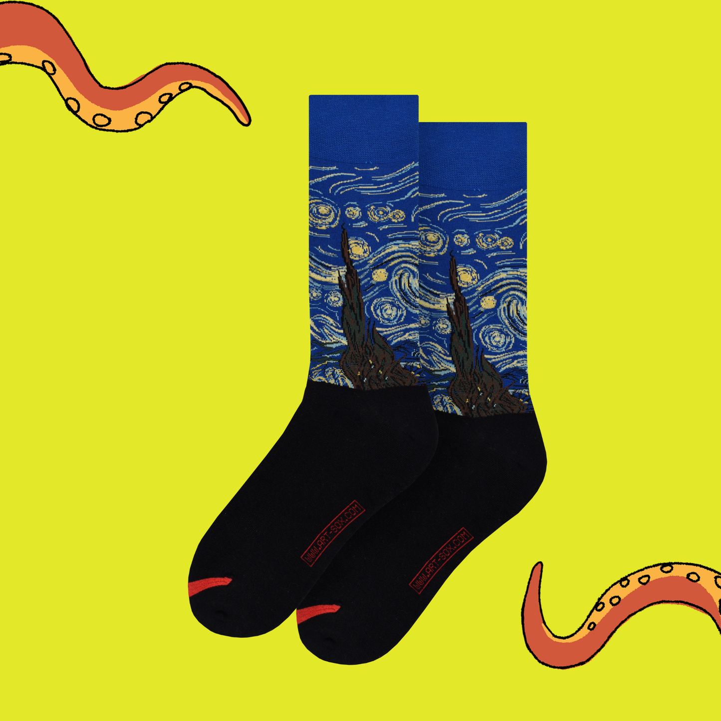 A pair of socks depicting the lovable duo of Tom and Jerry. Black legs, yellow toe, cuff and heel.