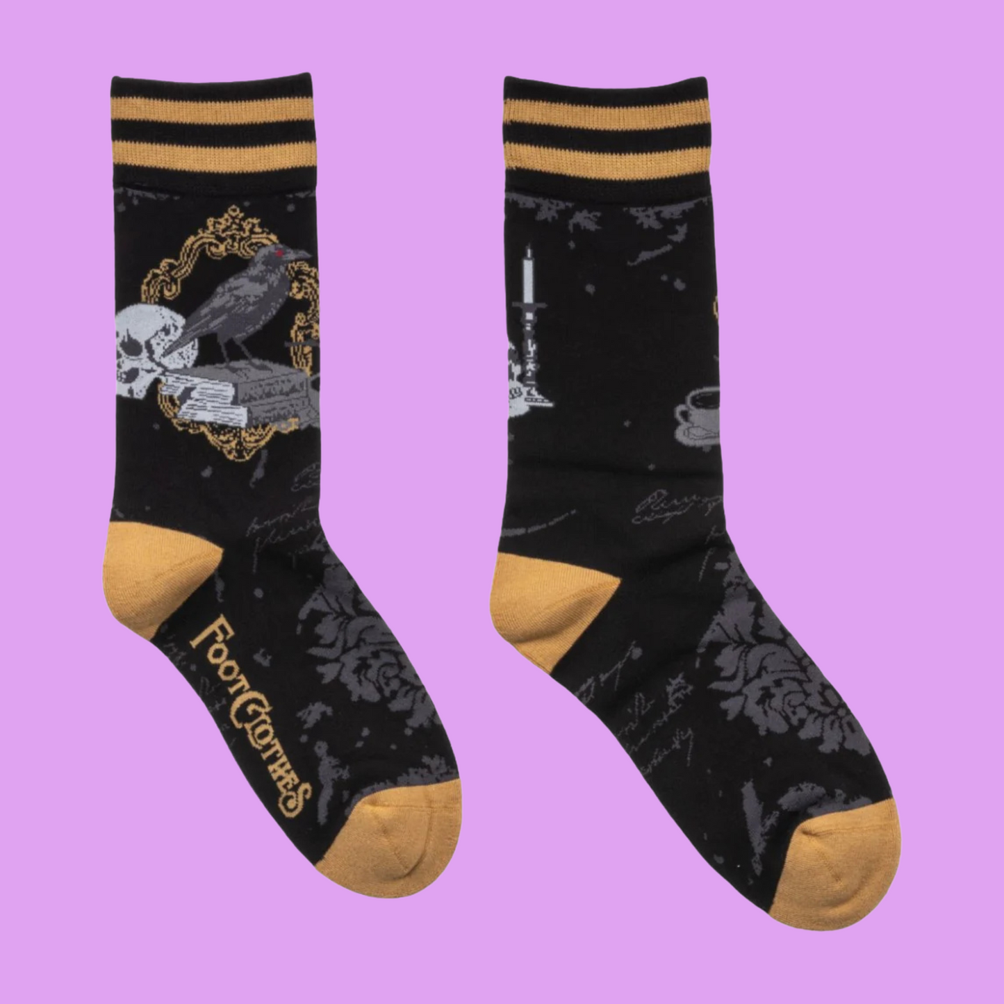 Step into a world of mystery with Raven's Grimoire Crew Socks.
