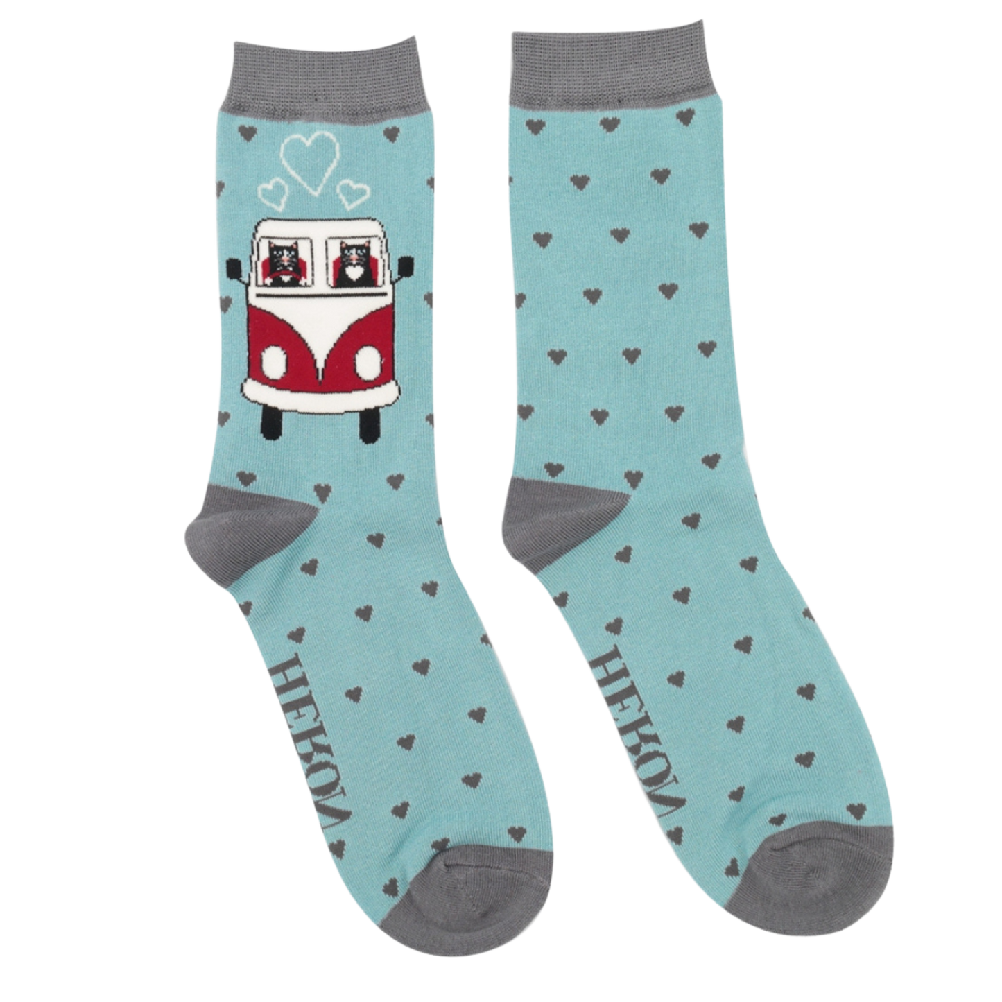 These green bamboo socks are patterned with pastel hearts and feature two cats up front in a vintage campervan, clearly on their way to somewhere better than Monday.