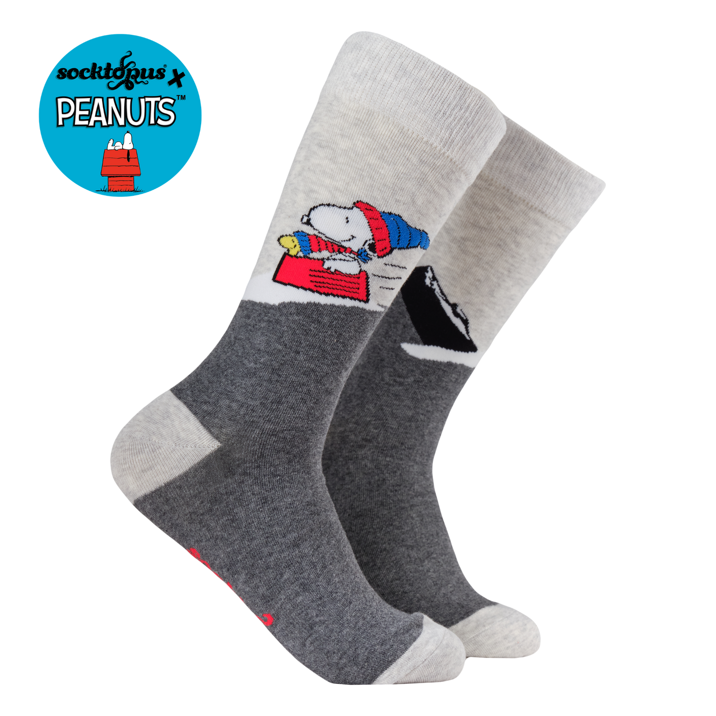 A pair of socks depicting primroses. Black legs, green cuff, heel and toe.