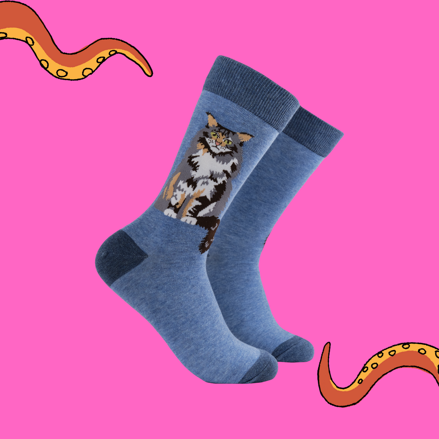 Lovely Cats Bamboo Socks - Miss Sparrow. A pair of socks featuring a happy cat. Pink striped legs. Blue heel toe and cuff.