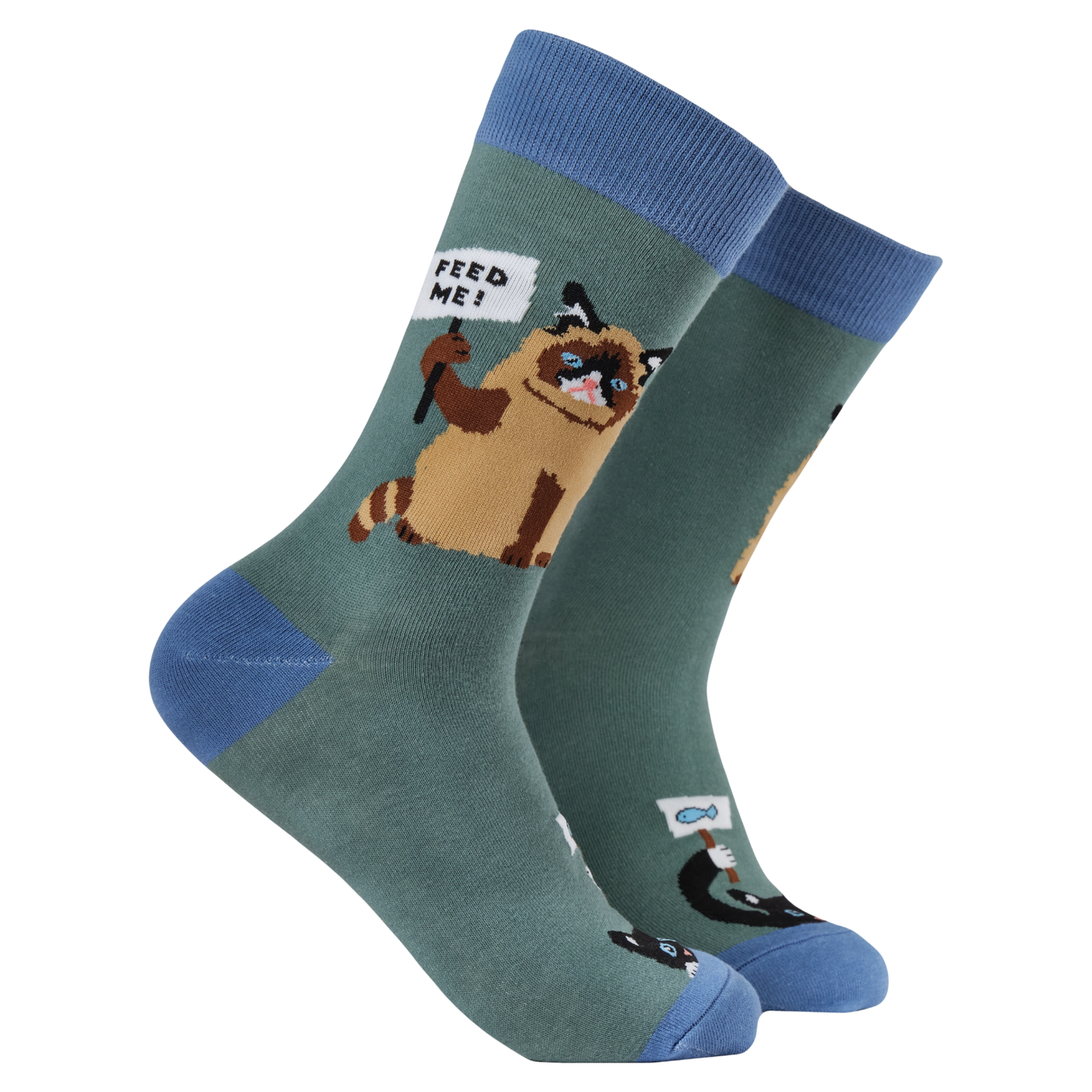 A pair of socks featuring an evil dragon. Blue legs, green heel, toe and cuff.