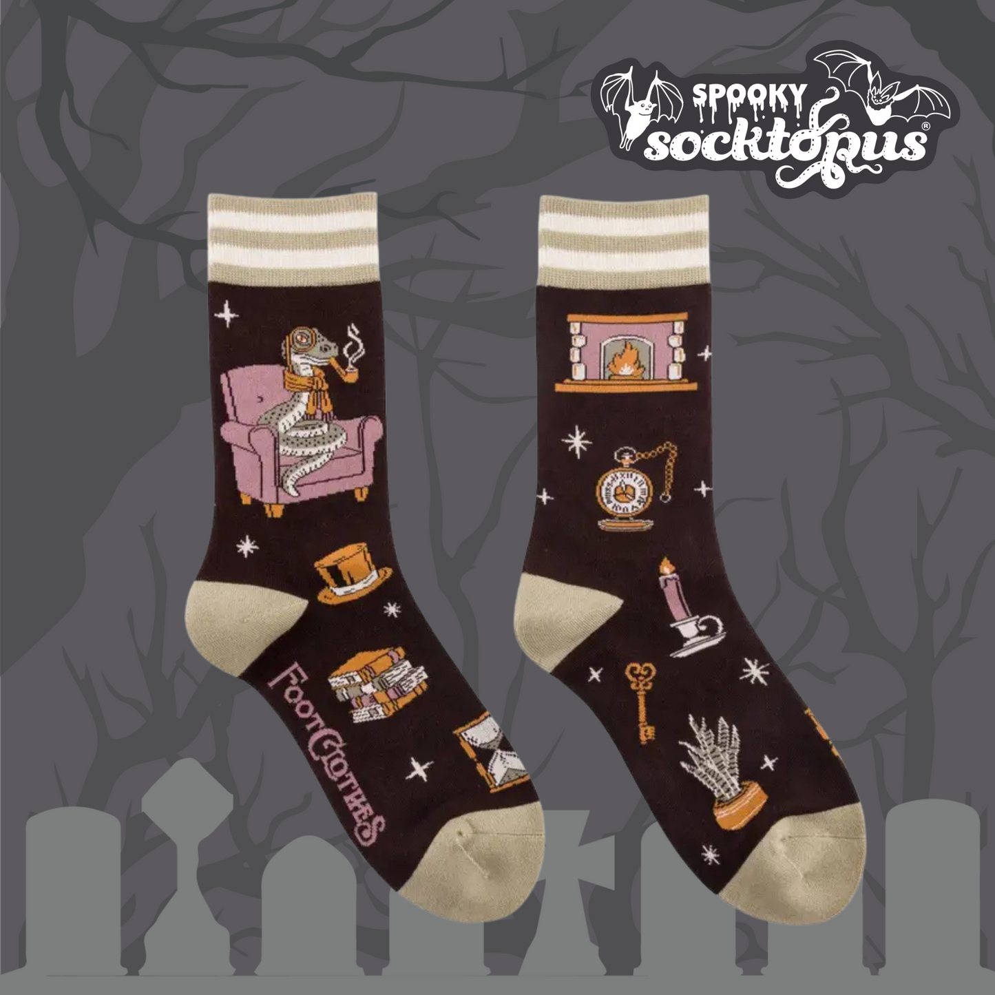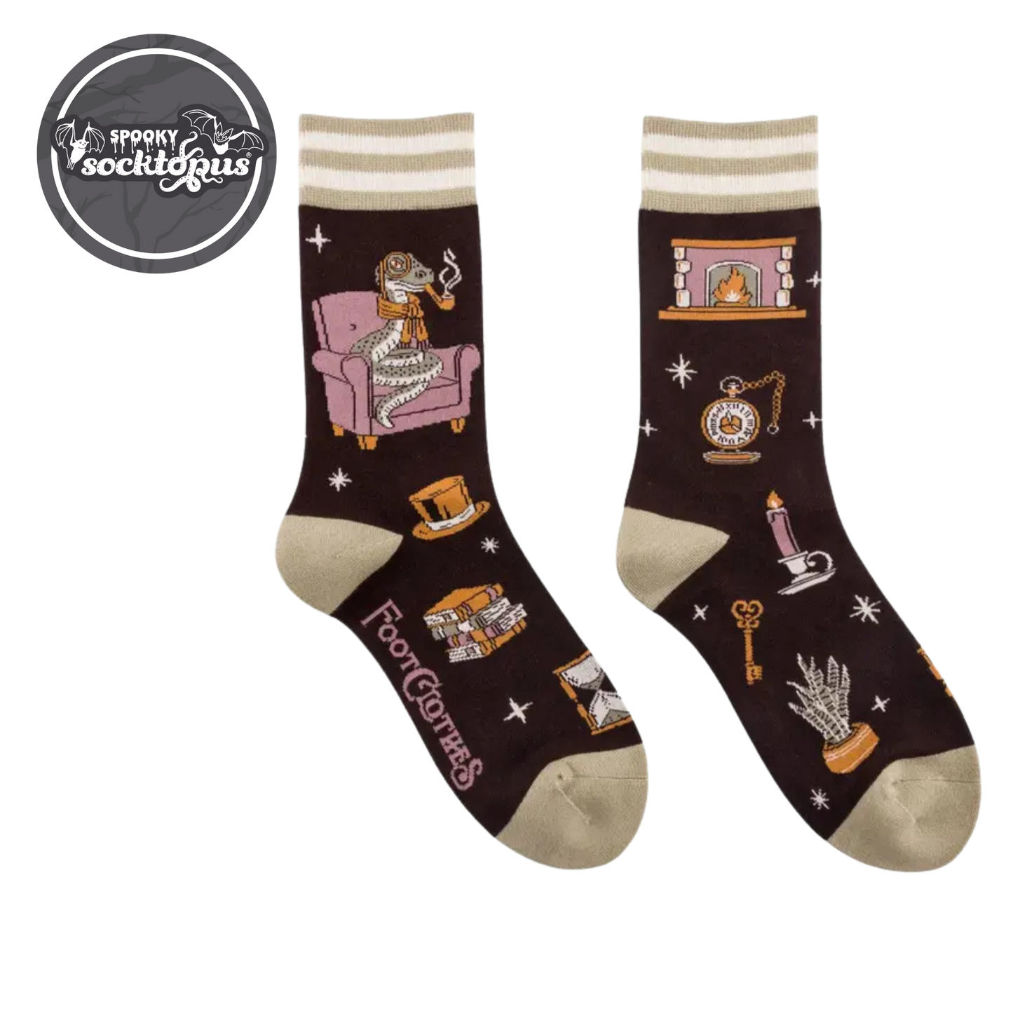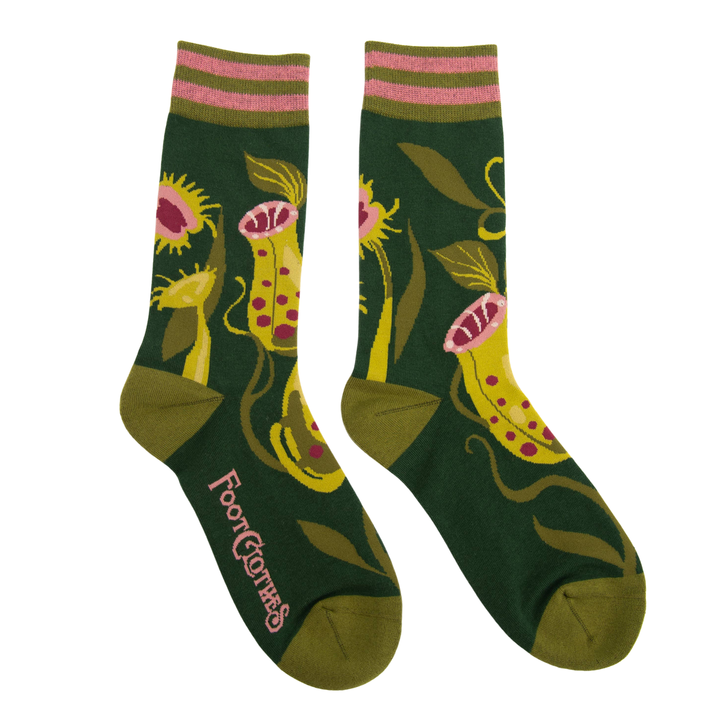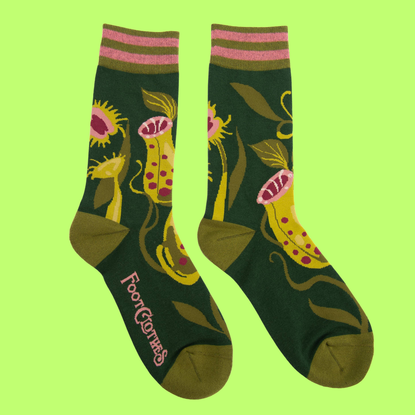 El Chupacabra Crew Socks. A pair of socks featuring El Chupacabra. Green legs, heel, toe and cuff.