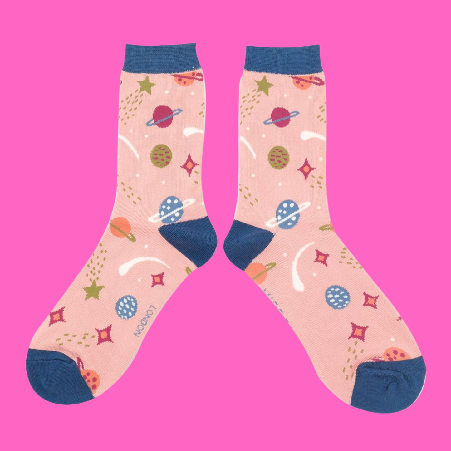Seashells Bamboo Socks - Miss Sparrow. A pair of socks featuring a fun seaside motif. Pink legs, grey heel, toe and cuff.