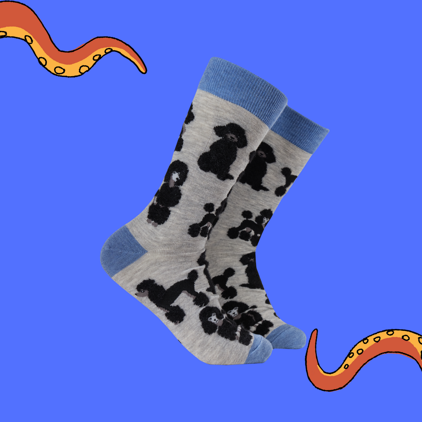 A pair of winter socks depicting sausage dogs. Orange toe, heel and cuff.