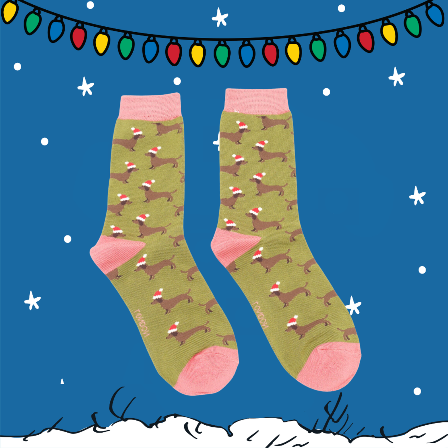 Xmas Sloths Bamboo Socks - Miss Sparrow. A pair of socks depicting xmas sloths wearing santa hats. Pink legs, red heel, toe and cuff.