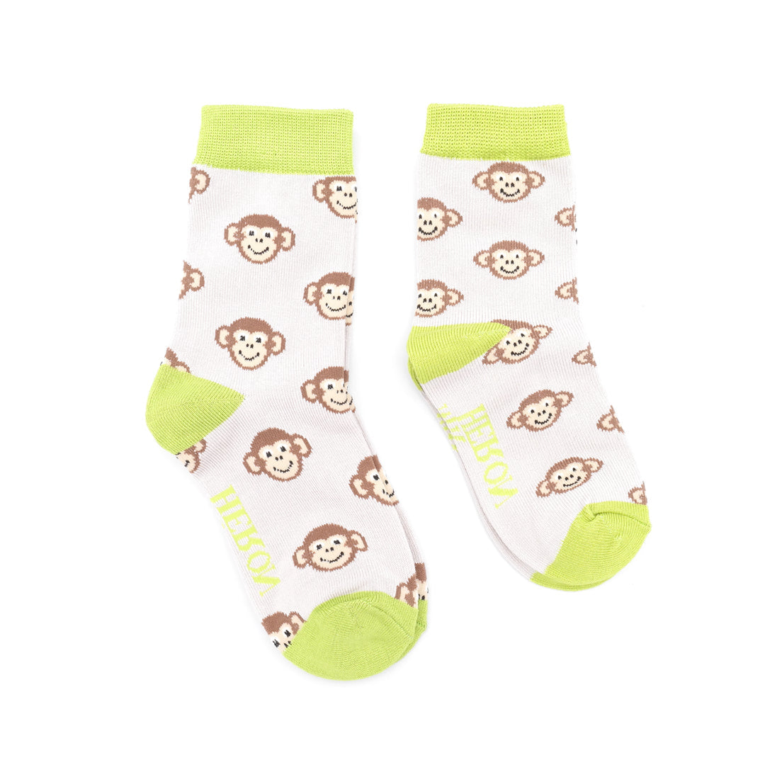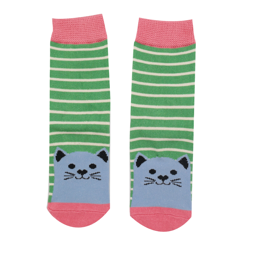 Cats & Prints Bamboo Socks - Miss Sparrow. A pair of socks featuring cats and cat prints. Light green legs, dark green heel, toe and cuff.