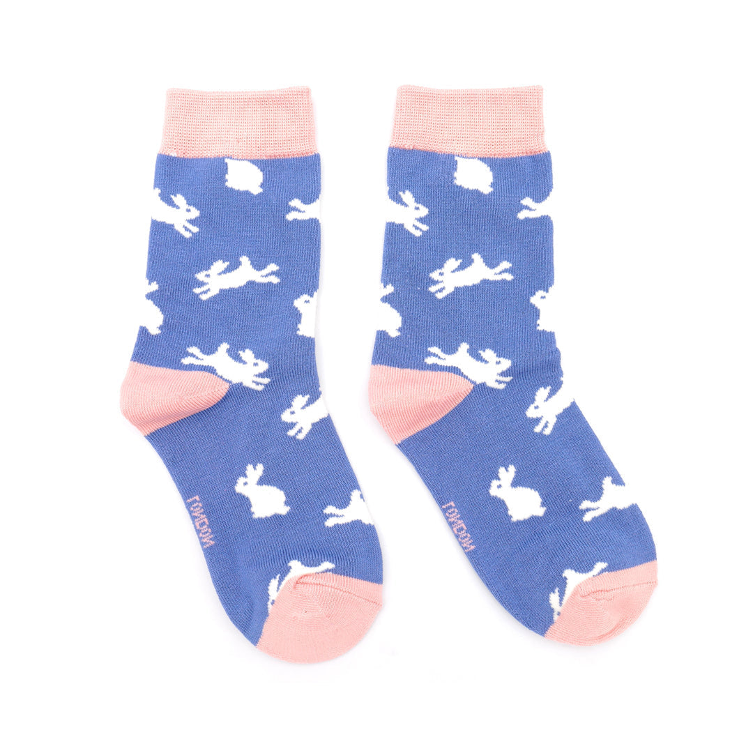 Horses Bamboo Socks - Miss Sparrow. A pair of light pink socks featuring a blue horse pattern. White cuffs, heels, and toes. Socks shown on a white background.