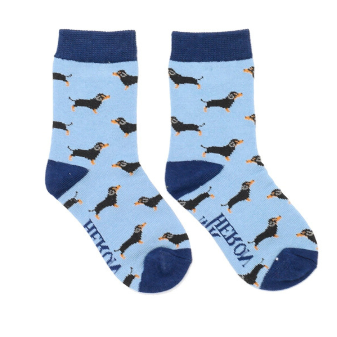 Birthday Sausage Dogs Bamboo Socks - Miss Sparrow. A pair of socks featuring sausage dogs all dressed up for a party. Blue legs, white heel, toe and cuff.