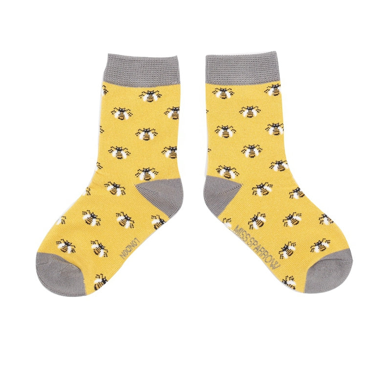 Love Bugs Bamboo Socks - Miss Sparrow. A pair of socks with a bugs motif. Blue legs, yellow heel, toe and cuff.