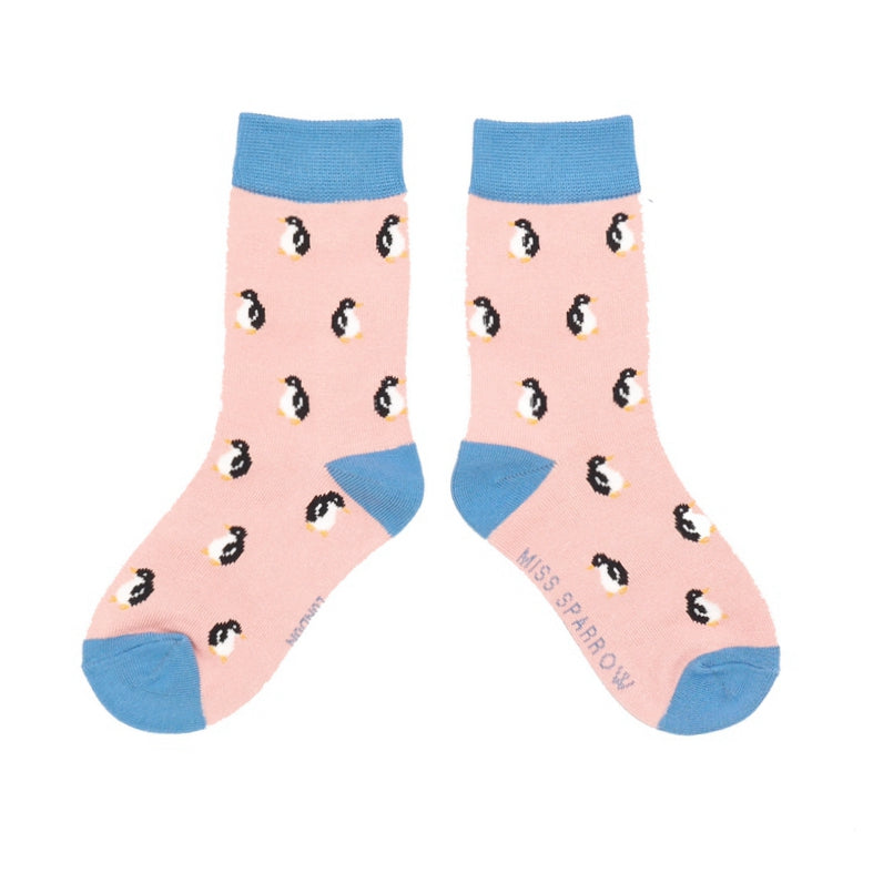 Puffins Bamboo Socks - Miss Sparrow. A pair of socks with a puffin motif. Blue legs, yellow heel, toe and cuff.