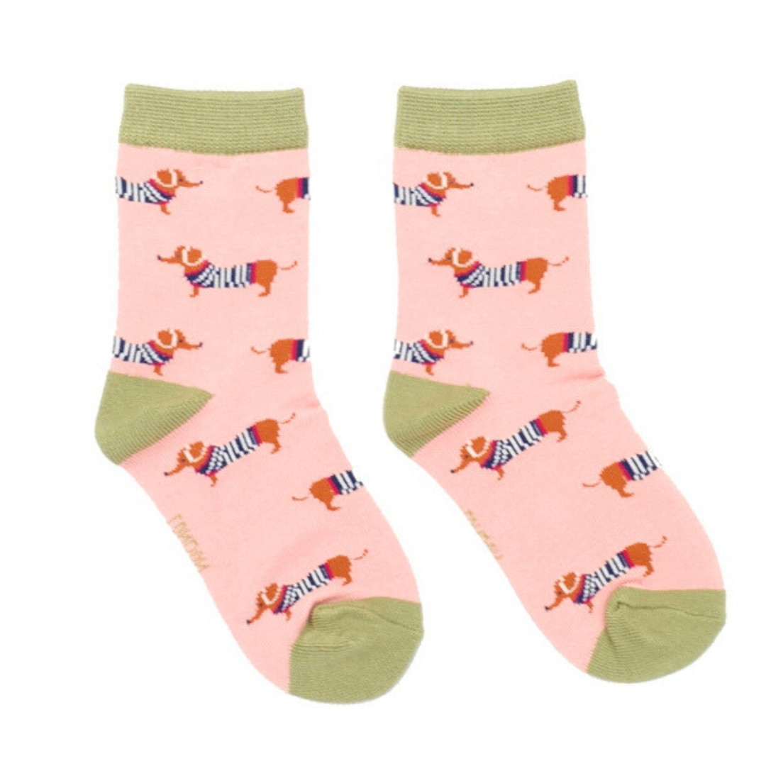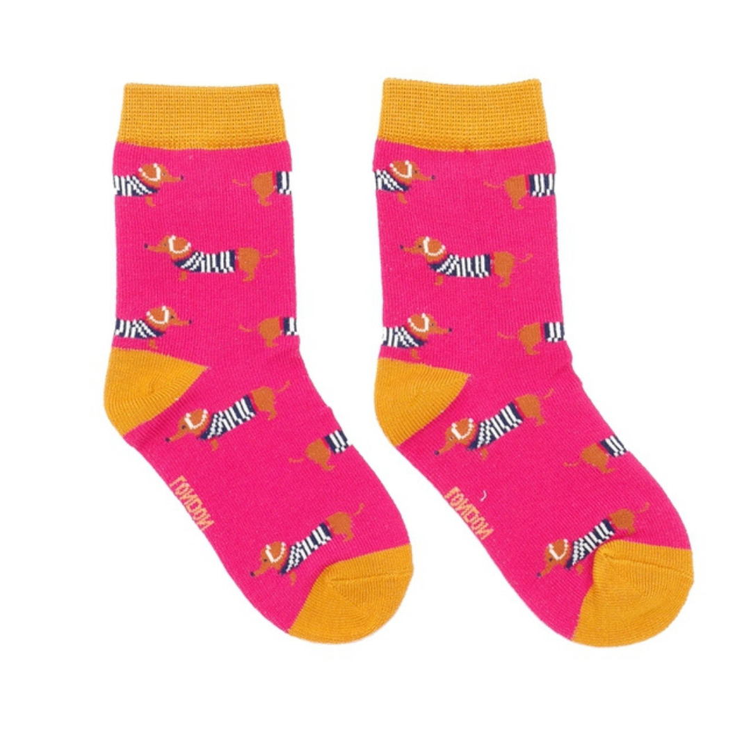Winter Little Sausage Dogs Bamboo Socks - Miss Sparrow. A pair of winter socks depicting sausage dogs. Pink toe, heel and cuff.