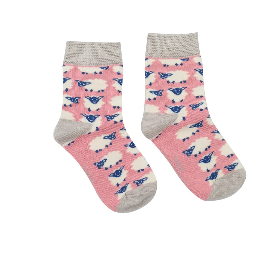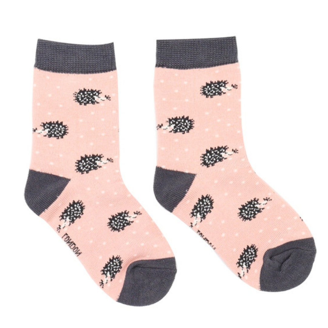 Seashells Bamboo Socks - Miss Sparrow. A pair of socks featuring a fun seaside motif. Pink legs, grey heel, toe and cuff.