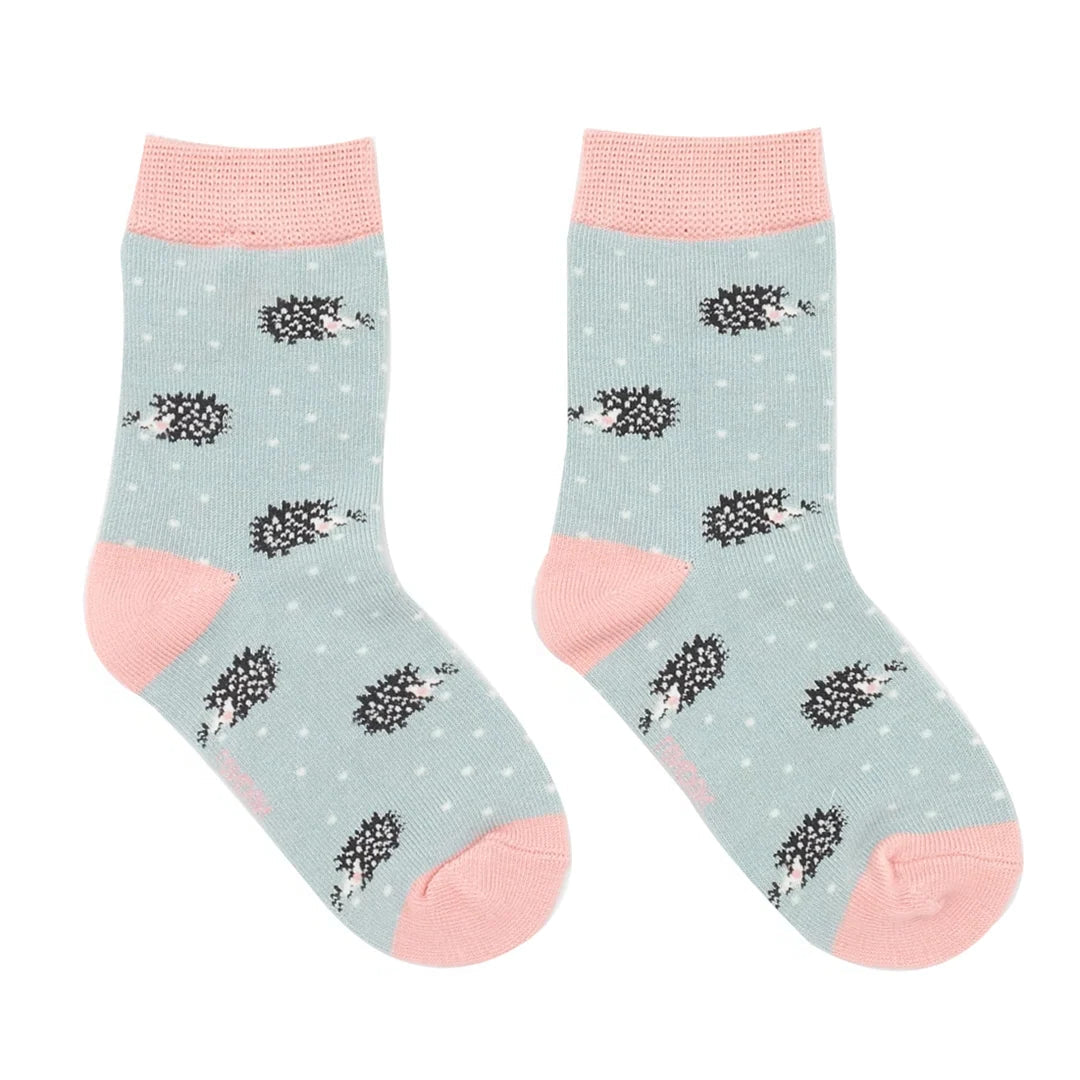Tulips Bamboo Socks - Miss Sparrow. A pair of light blue socks featuring white polka dots, and a light pink and green tulips pattern. Light green cuffs, heels, and toes. Socks shown on a white background.