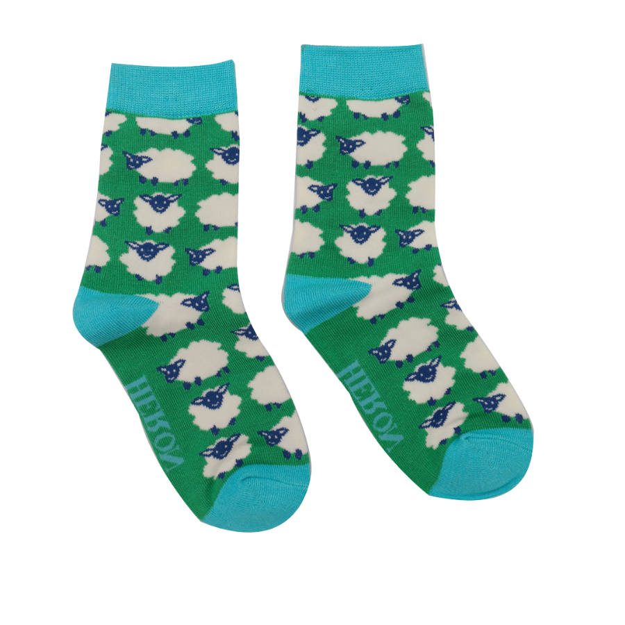 Mountain Scene Bamboo Socks - Miss Sparrow. A pair of socks featuring a mountain scene. Green heel, toe and cuff.