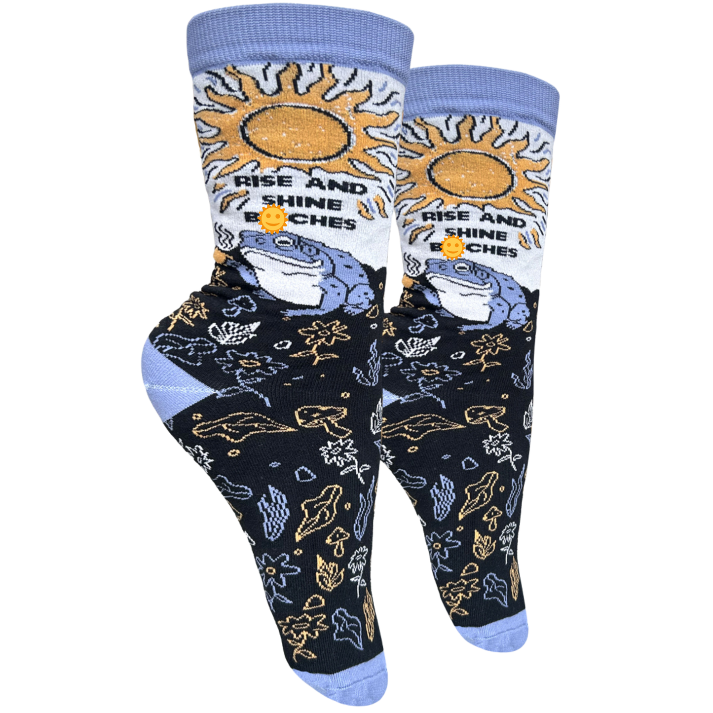 It's time to get up, grab a coffee and start the day right with these Rise and Shine B**ches socks from international sock brand Groovy Things Co.