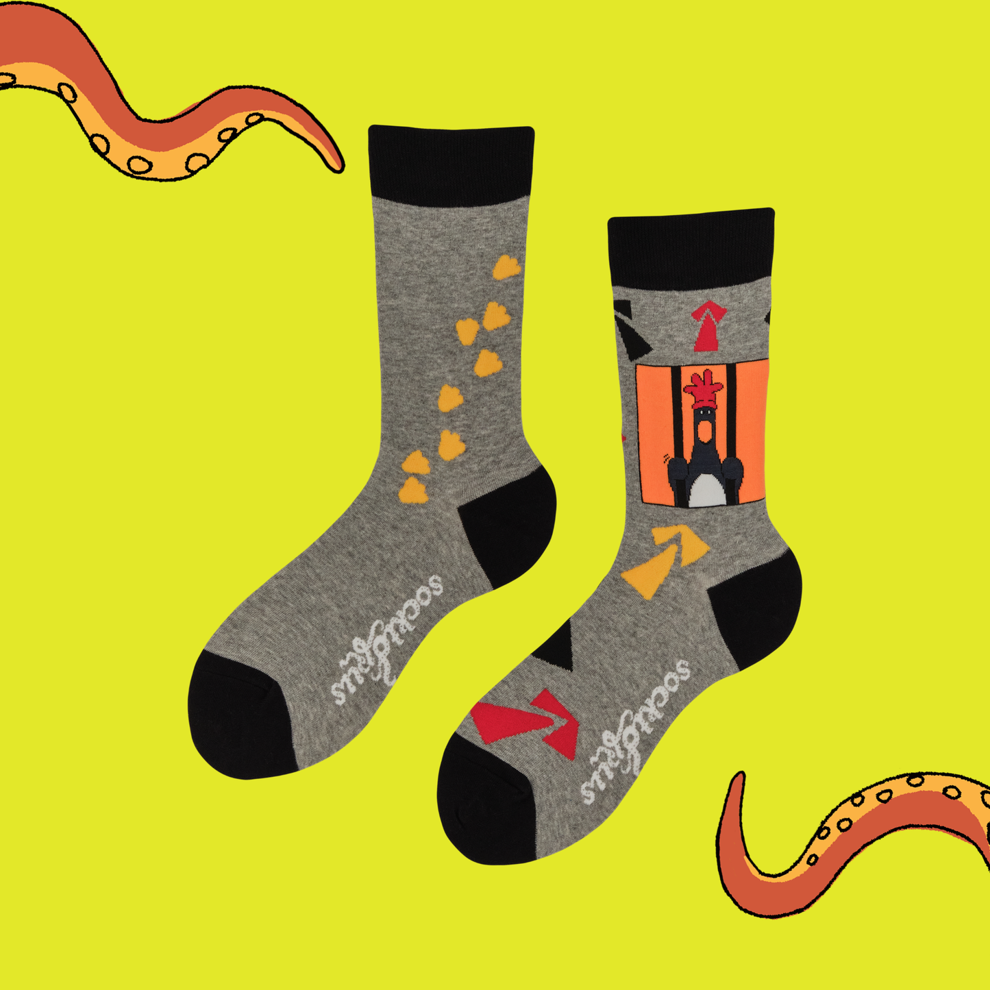 One sock features the infamous Feathers McGraw in full “definitely-not-a-chicken” disguise, while the other trails a scatter of colourful arrows pointing in every possible getaway direction.